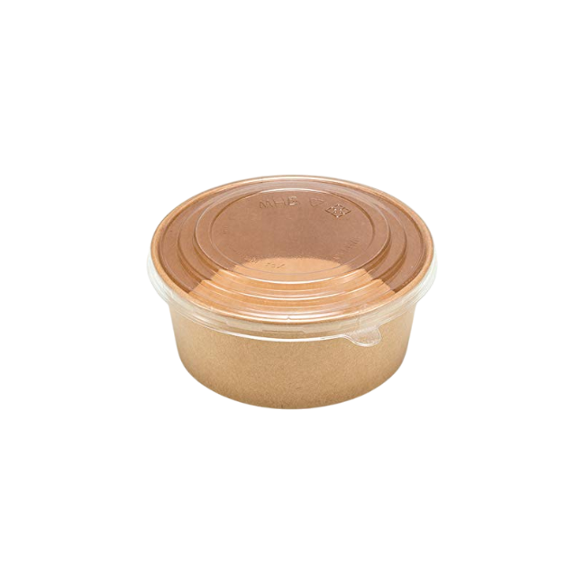 A Kraft salad bowl with a lid is an eco-friendly, disposable food container made from sturdy Kraft paper, suitable for both hot and cold foods, and features a leak-resistant design for secure transport. These bowls are commonly used for salads, pasta, and other meals, and often have a food-safe, leak-proof interior coating. The bowls are durable, stackable, and often available in various sizes, with clear PET lids to keep contents fresh.